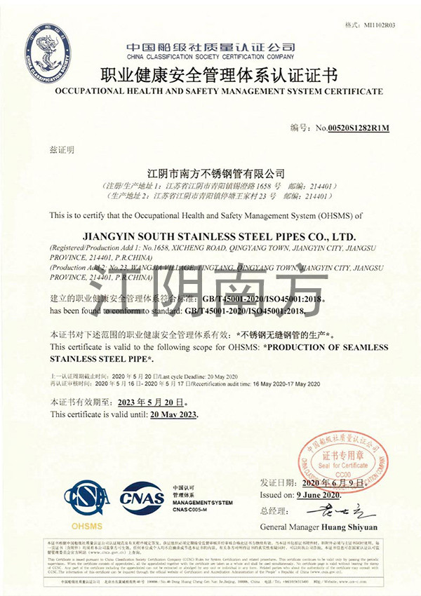 职业健康安全管理体系认证证书